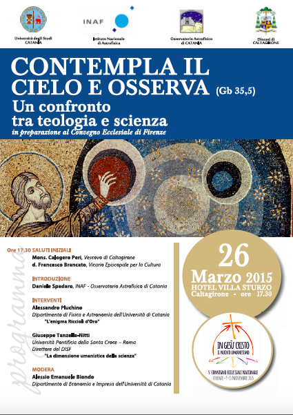 All’incontro partecipano S.E. mons. Calogero Peri (vescovo di Caltagirone), don Francesco Brancato (vicario episcopale per la Cultura), Daniele Spadaio (Osservatorio Astronomico dell’Etna, INAF), Alessandro Plachino (Dipartimento di Fisica e Astronomia dell’Università di Catania), Giuseppe Tanzella-Nitti (Università Pontificia della Santa Croce, Roma – Direttore del DISF). Modera  Alessio Emanuele Biondo (Dipartimento di Economia e Impresa dell’Università di Catania).