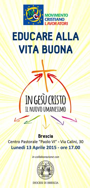 Il Movimento Cristiano Lavoratori e la Diocesi di Brescia organizzano un incontro in preparazione al 5° Convegno Ecclesiale Nazionale nell’ambito di un ciclo di appuntamenti previsti in Lombardia, Toscana, Emilia-Romagna, Marche e Campania. Si comincia il 13 aprile 2015 alle 17 nella sala “Franceschetti” del Centro Pastorale Paolo VI di Brescia. A tema una delle cinque “vie” verso l’umanità nuova proposti dalla Traccia: educare. Interverranno Pierpaolo Triani, don Francesco Poli e Lorenzo Rosoli.
