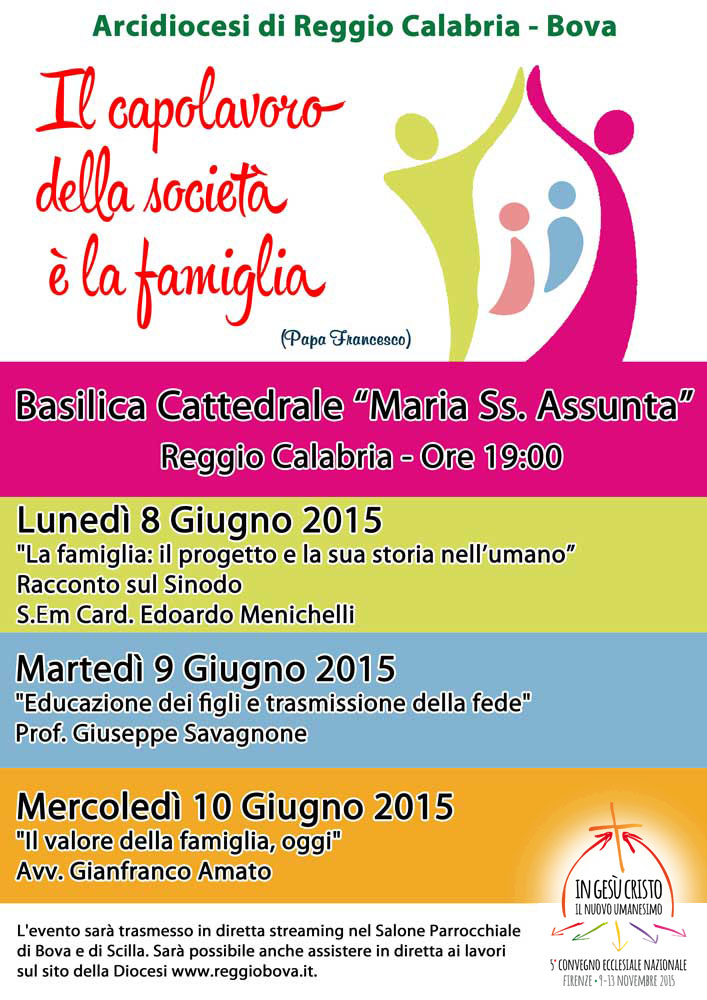 Da lunedì 8 a mercoledì 10 giugno 2015 si svolge nella Cattedrale di Reggio Calabria un convegno dal titolo: “Il capolavoro della società è la famiglia”, espressione utilizzata più volte da Papa Franceso, che vedrà susseguirsi tre relatori di elevato profilo: il cardinale Edoardo Menichelli, Arcivescovo di Ancona, il professore Giuseppe Savagnone, esperto in tematiche educative, e il giurista Gianfranco Amato, presidente dell’associazione “Giuristi per la vita”.