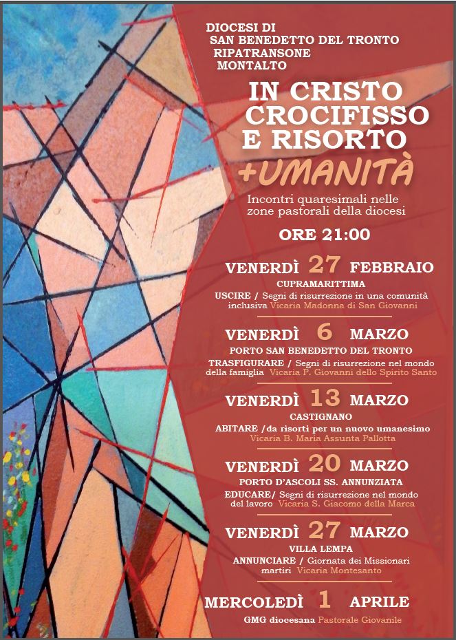 Per la Quaresima 2015 la diocesi di San Benedetto del Tronto-Ripatransone-Montalto propone un ciclo di incontri nelle zone pastorali della diocesi. Un incontro da vivere nelle vicarie, un “convenire” ogni settimana, in una diversa vicaria, per camminare insieme verso la Pasqua e farsi attenti alle periferie esistenziali. Gli incontri saranno preparati insieme dai presbiteri e se possibile dai consigli pastorali con il contributo di alcuni uffici: sarà motivo per lavorare insieme nelle diverse zone della diocesi.