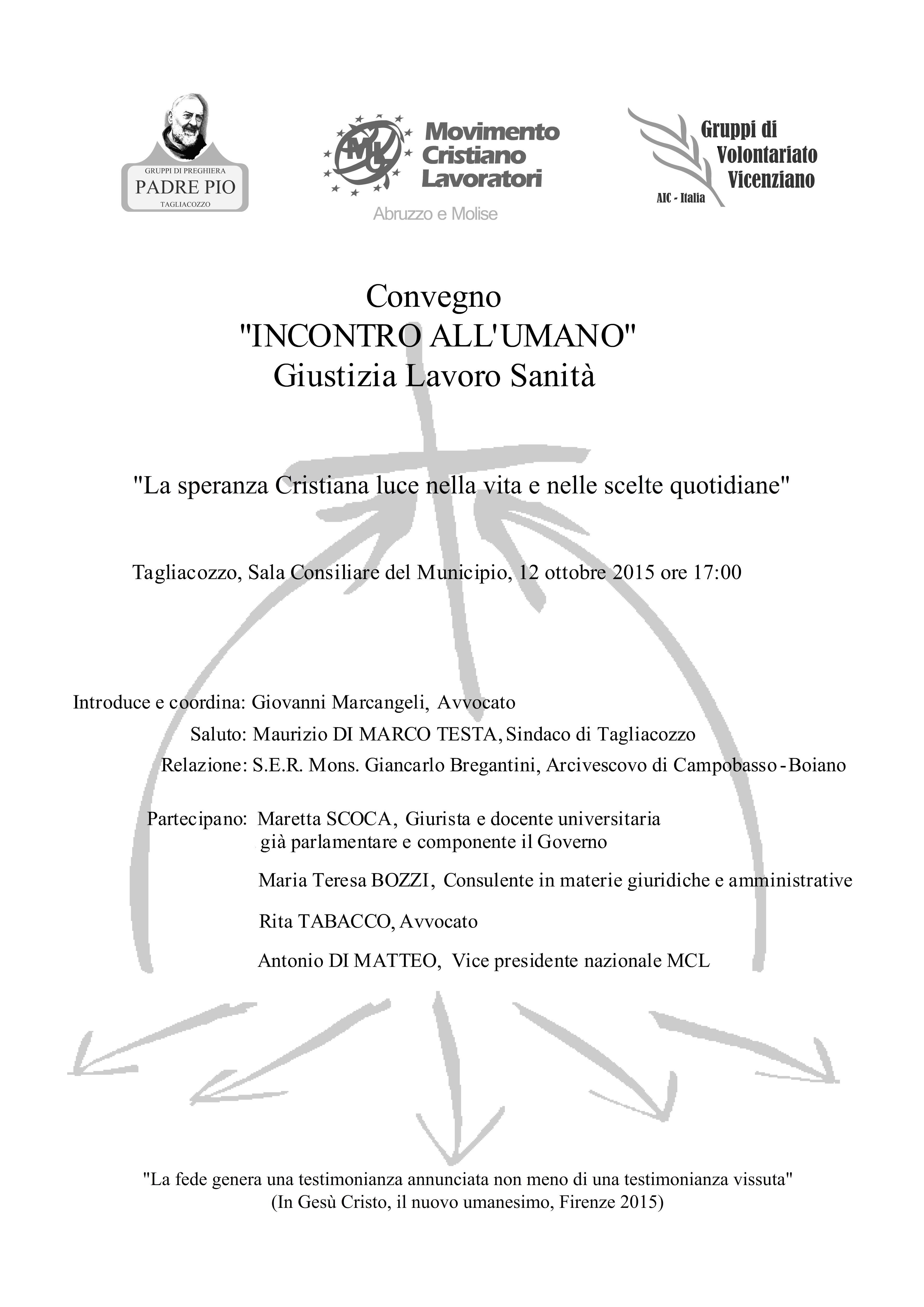 Il Movimento Cristiano Lavoratori Abruzzo-Molise organizza, in preparazione a Firenze 2015, un convegno intitolato Incontro all’umano. Giustizia, Lavoro, Sanità. La speranza Cristiana luce nella vie e nelle scelte quotidiane. Il convegno avrà luogo lunedì 12 ottobre alle ore 17 nella sala consiliare del Municipio di Tagliacozzo (Aq).
