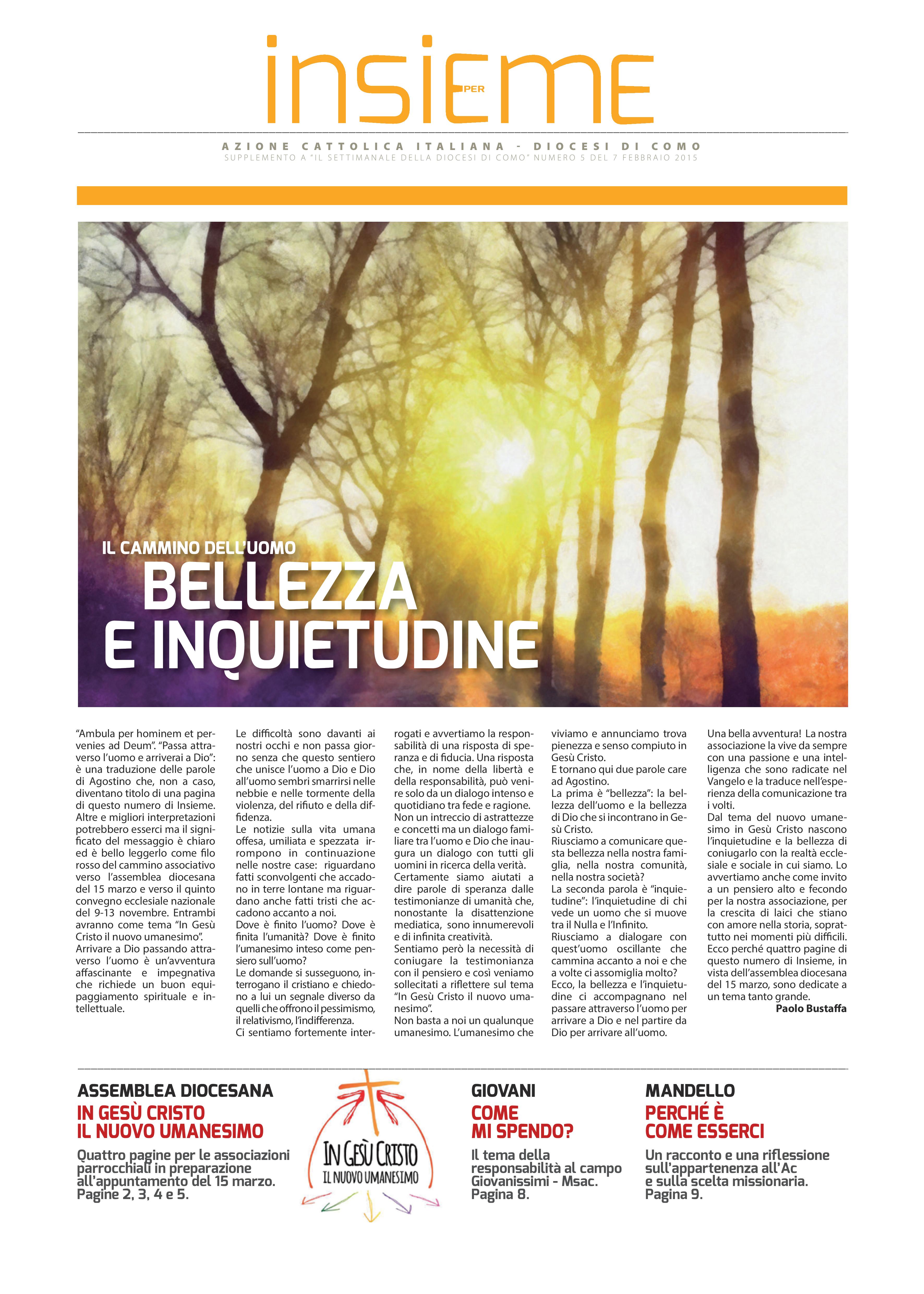 Il numero di febbraio 2015 di Insieme, Supplmento a “Il Settimanale” della diocesi di Como a cura dell’Azione Cattolica diocesana, dedica le prime cinque pagine al tema del 5° Convegno Ecclesiale Nazionale In Gesù Cristo il nuovo umanesimo, scelto anche come titolo dell’assemblea diocesana del 15 marzo a Como. Accanto ad alcune importanti riflessioni è pubblicata una pagina che propone tre percorsi: preghiera, riflessione e racconto di un’esperienza umana particolare, raccontata dalle associazioni parrocchiali.