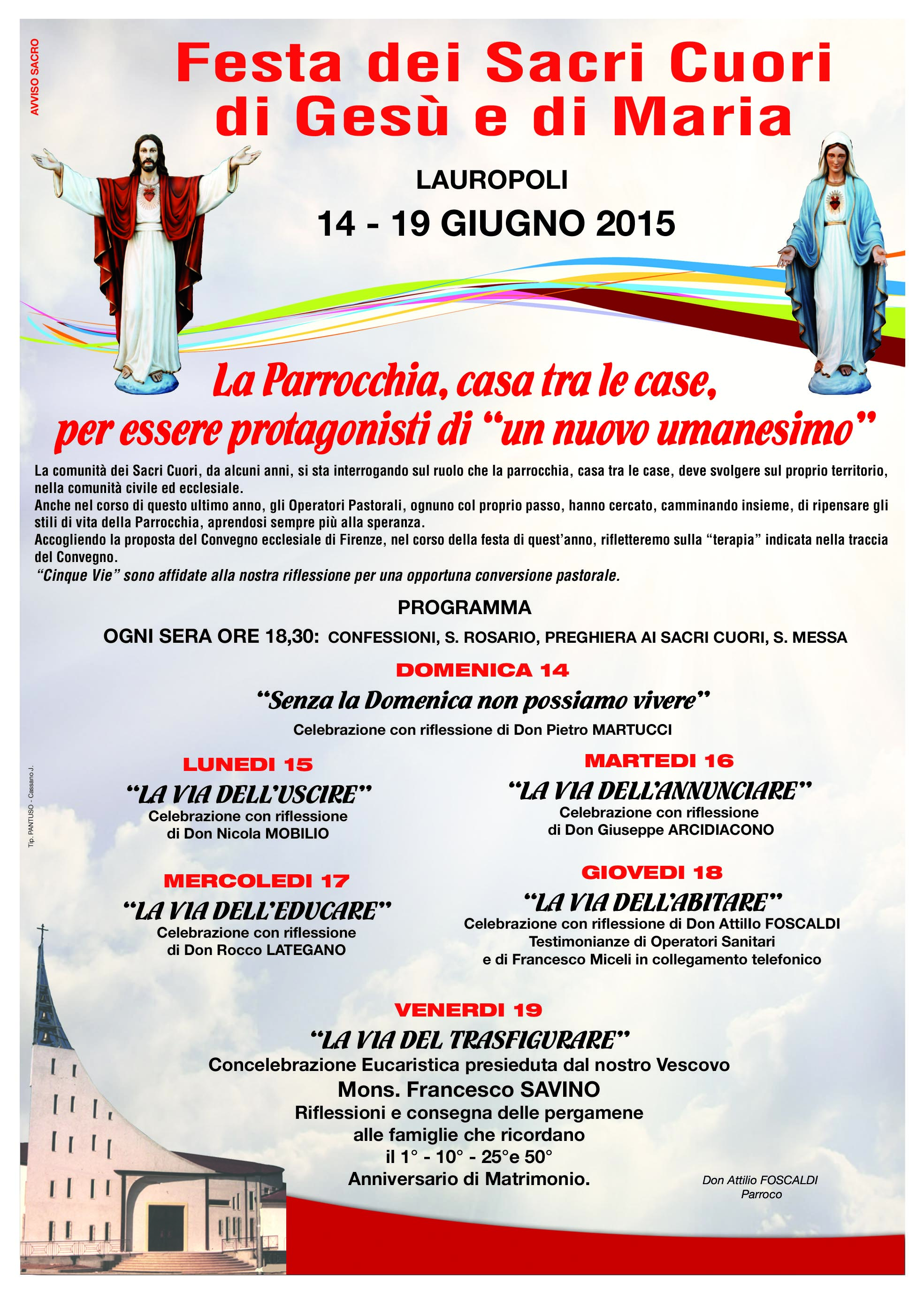 La Parrocchia, casa tra le case, per essere protagonisti di “un nuovo umanesimo”. È il tema scelto per festeggiare, dal 14 al 19 giugno, i Sacri Cuori di Gesù e di Maria a Lauropoli, nella parrocchia guidata da don Attilio Foscaldi. “Accogliendo la proposta del Convegno ecclesiale di Firenze, nel corso della festa di quest’anno – spiega il parroco – rifletteremo sulla ‘terapia’ indicata nella traccia del convegno” che si terrà a Novembre. “Cinque vie” sono indicate alla riflessione. La festa terminerà venerdì 19 con la concelebrazione eucaristica presieduta dal Vescovo, mons. Francesco Savino.