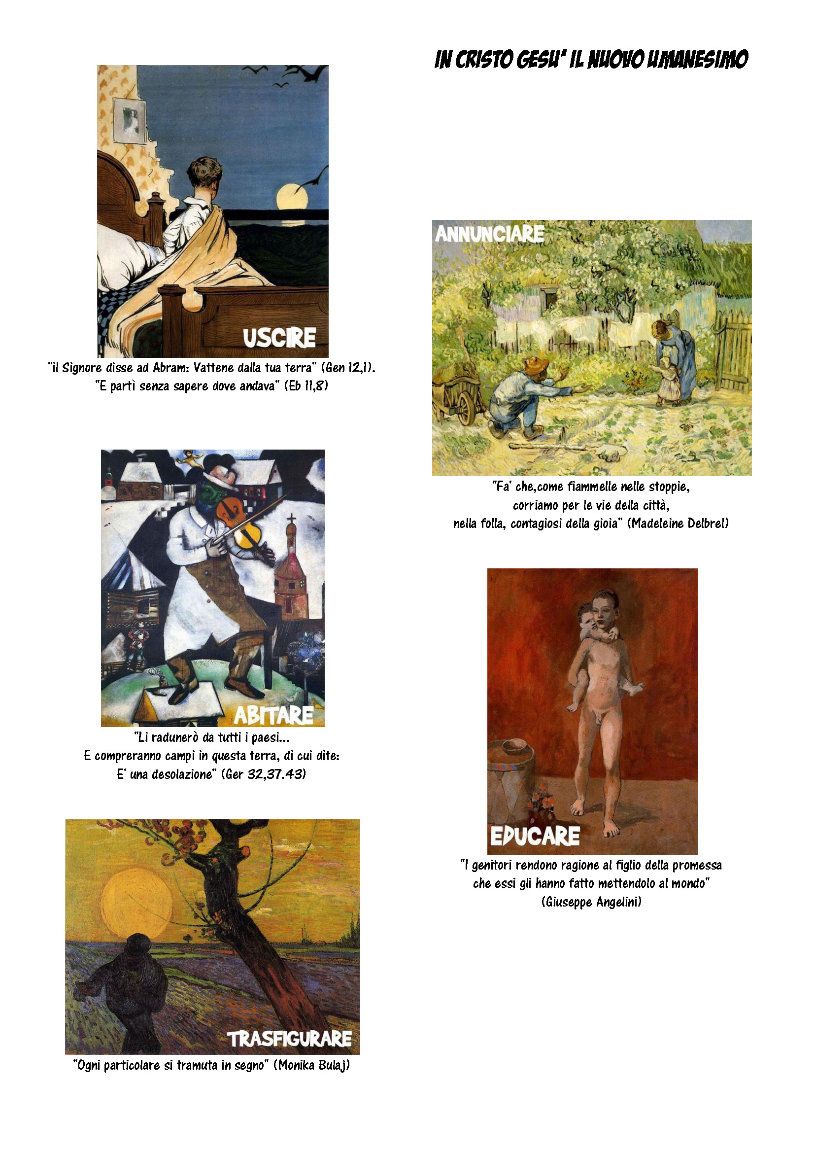 Il lavoro, proposto a giovani dai 19 ai 30 anni della Parrocchia di Maria Madre della Chiesa, Lavagna (GE), consiste nella visualizzazione dei cinque verbi del Convegno attraverso opere d’arte, cercando di leggerne i risvolti antropologici e teologici. Le domande poste per il lavoro individuale sono state due: qual è il verbo che sento prioritario per me e la mia comunità; quali passi posso dare in questa direzione?