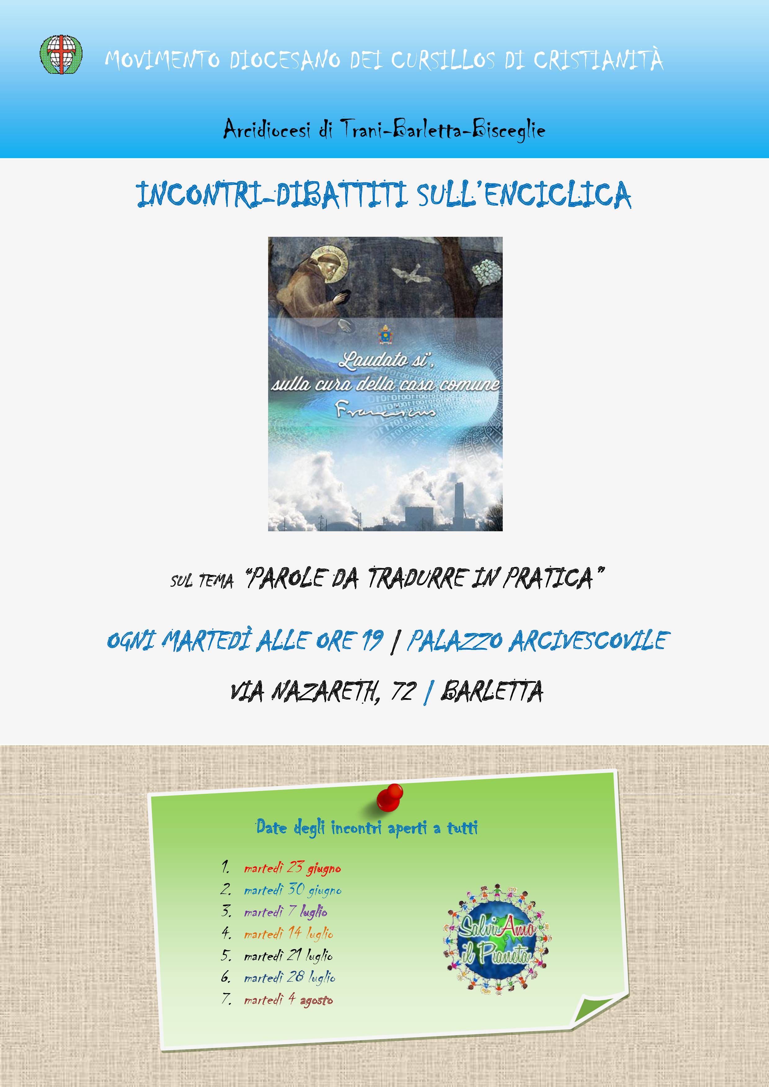 Il Movimento dei Cursillos di Cristianità della diocesi di Trani-Barletta-Bisceglie organizza un ciclo di incontri-dibattiti, aperti a tutti, sulla Lettera Enciclica Laudato si’ di Papa Francesco.