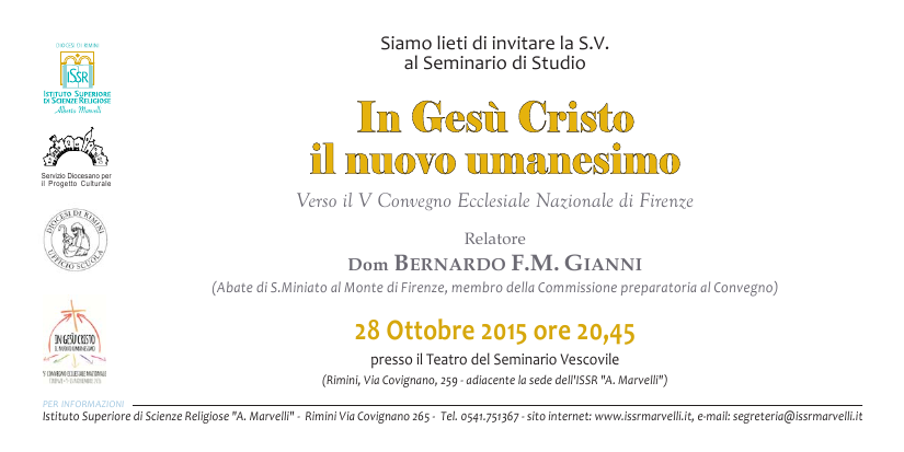Si svolge il 28 ottobre 2015 il seminario di studi organizzato dall’Istituto Superiore di Scienze Religiose “A. Marvelli” di Rimini in collaborazione con la Diocesi di Rimini e il Servizio diocesano per il Progetto culturale sul tema In Gesù Cristo il nuovo umanesimo. Verso il V Convegno Ecclesiale Nazionale di Firenze. L’evento avrà luogo alle ore 20.45 presso il Teatro del Seminario vescovile di Rimini (via Covignano 159). Interverrà p. Bernardo Gianni, abate di San Miniato al Monte e membro del Comitato preparatorio del Convegno Ecclesiale.