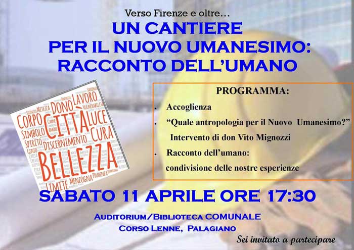 La diocesi di Castellaneta entra nel vivo del proprio percorso di preparazione al Convegno di Firenze. Sabato 11 aprile 2015 alle ore 17,30 all’Auditorium/Biblioteca, in corso Lenne a Palagiano (Ta), è in programma un incontro dal titolo Il racconto dell’umano. Dopo una conversazione iniziale con don Vito Mignozzi, delegato al Convegno Ecclesiale, sul tema “Quale antropologia per il Nuovo Umanesimo?”, interverranno anche alcuni laici cristiani della diocesi per favorire la messa in comune delle risorse culturali, spirituali e sociali.